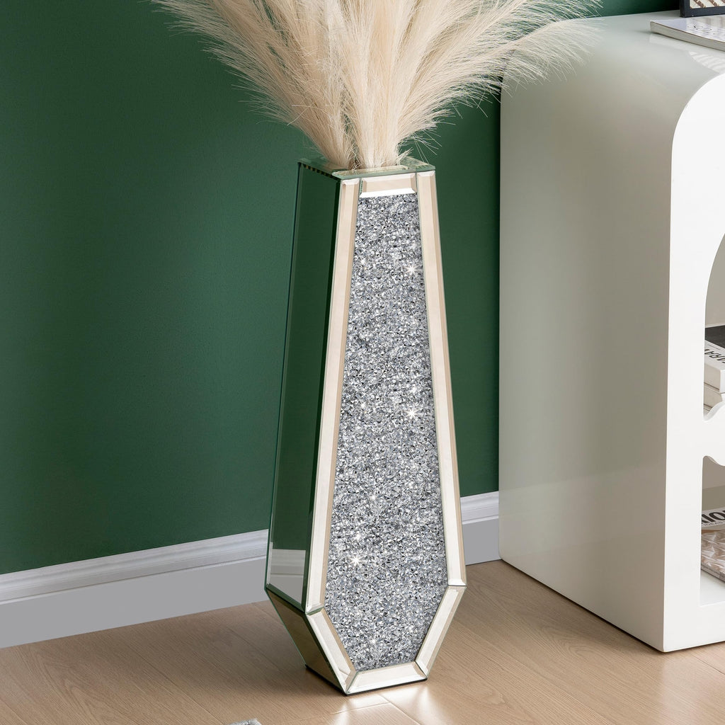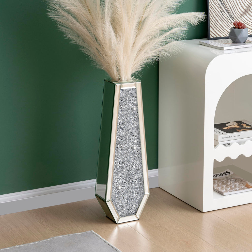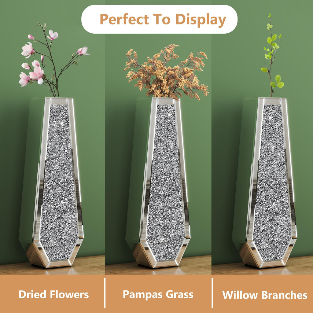 • SOPHISTICATED AND LUXURIOUS DESIGN ‒ This tall silver floor vase is inlaid with crystal crushed diamond on the front and covered by a high-definition eco-friendly mirror on the back. Shiny mirror tall vase, gorgeous appearance can blend with anywhere, which will add more vigor and sophistication to your room