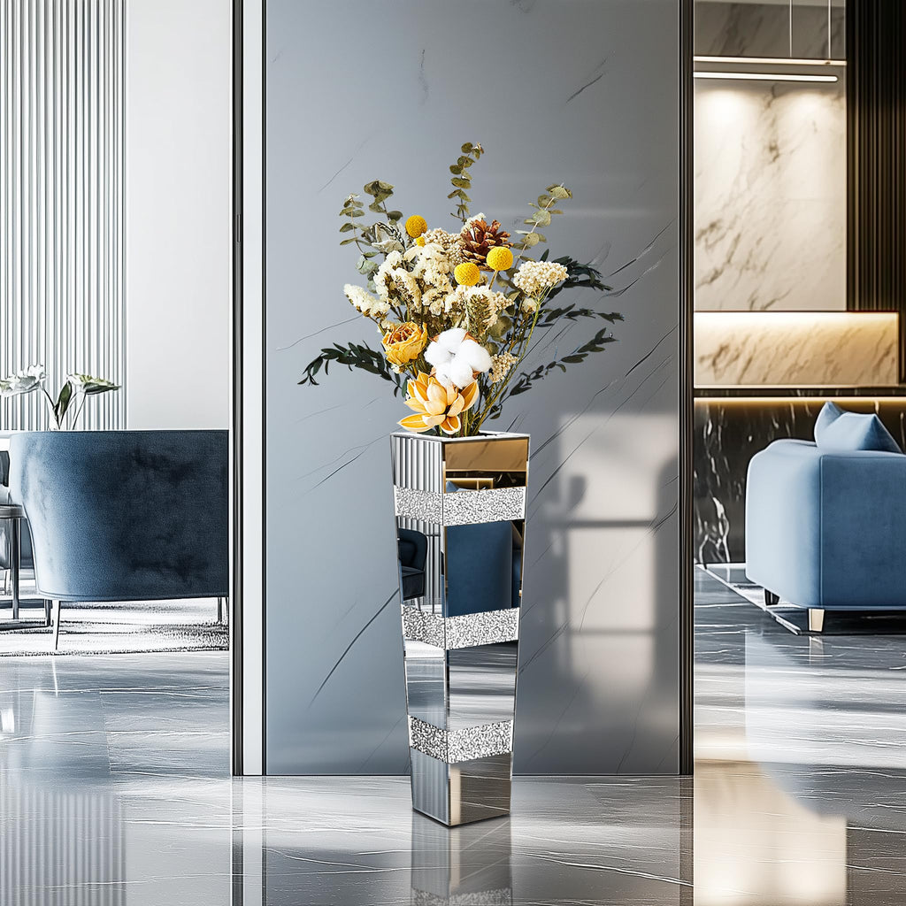 - Dual Decoration of Crushed Diamonds and Mirrored Surfaces - Crushed diamond floor vase , The front is inlaid with crystal diamonds, and the back is made of solid silver - mirrored panels , Hand-inlaid crystal diamonds on mirrored silver glass make this vase sparkle from every angle, Mirrored glass floor vase reflects light to enhance the brightness of the space , Whether placed empty or with flower arrangements, it presents a high - end banquet - level decorative effect